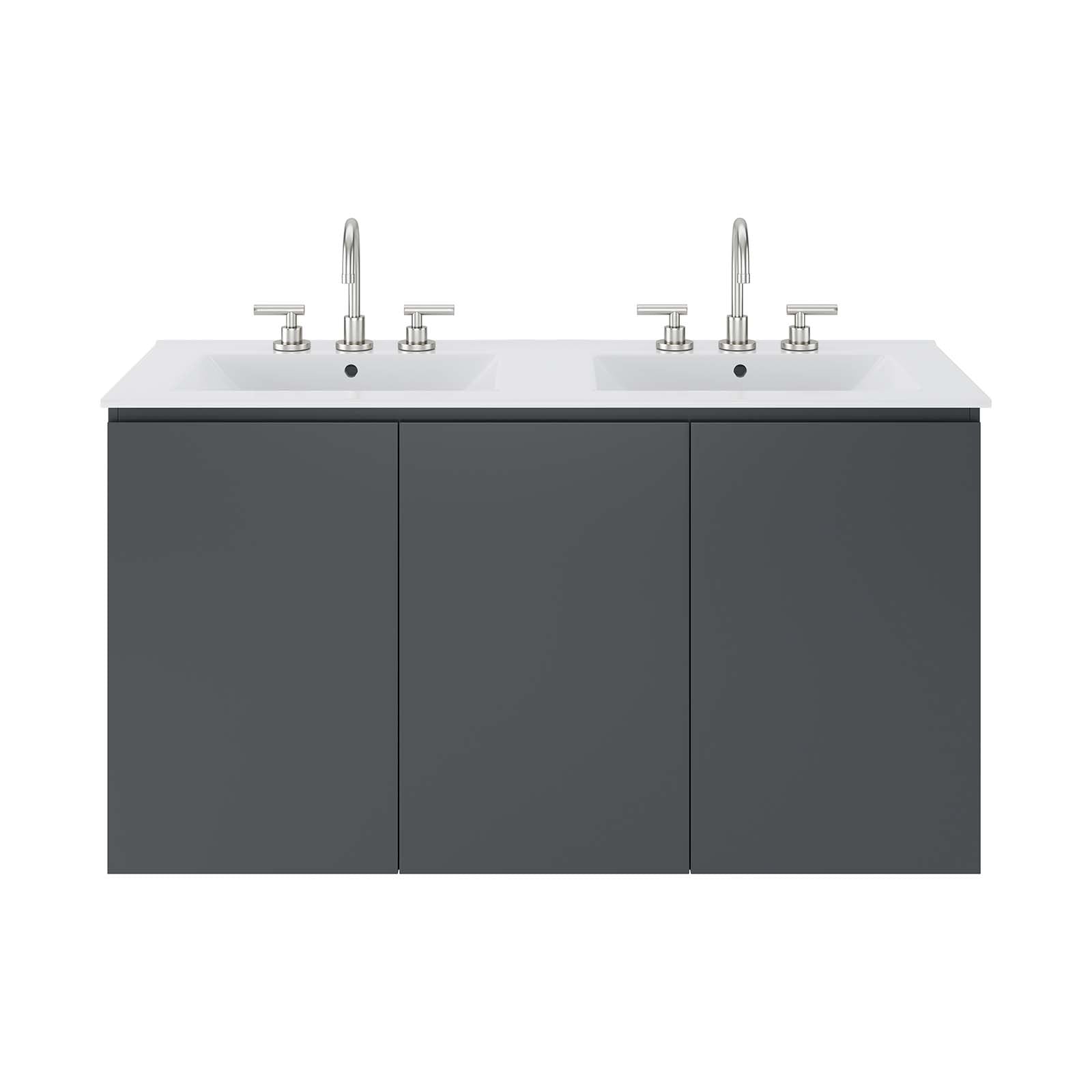 The sleek look and clean-lined silhouette of the Bryn 48" Wall-Mount Double Sink Bathroom Vanity add modern style to your bathroom space. Durably crafted with particleboard and melamine, this vanity mounts directly to the wall and features ample storage space under the sink behind three soft-close doors. Bryn features a cut-out design to accommodate plumbing. This vanity is complete with a double sink ceramic basin with 8-inch centerset holes and an integrated countertop. Fixtures not included. Assembly required. Set Includes: One - Bryn 48" Wall-Mount Double Sink Bathroom Vanity