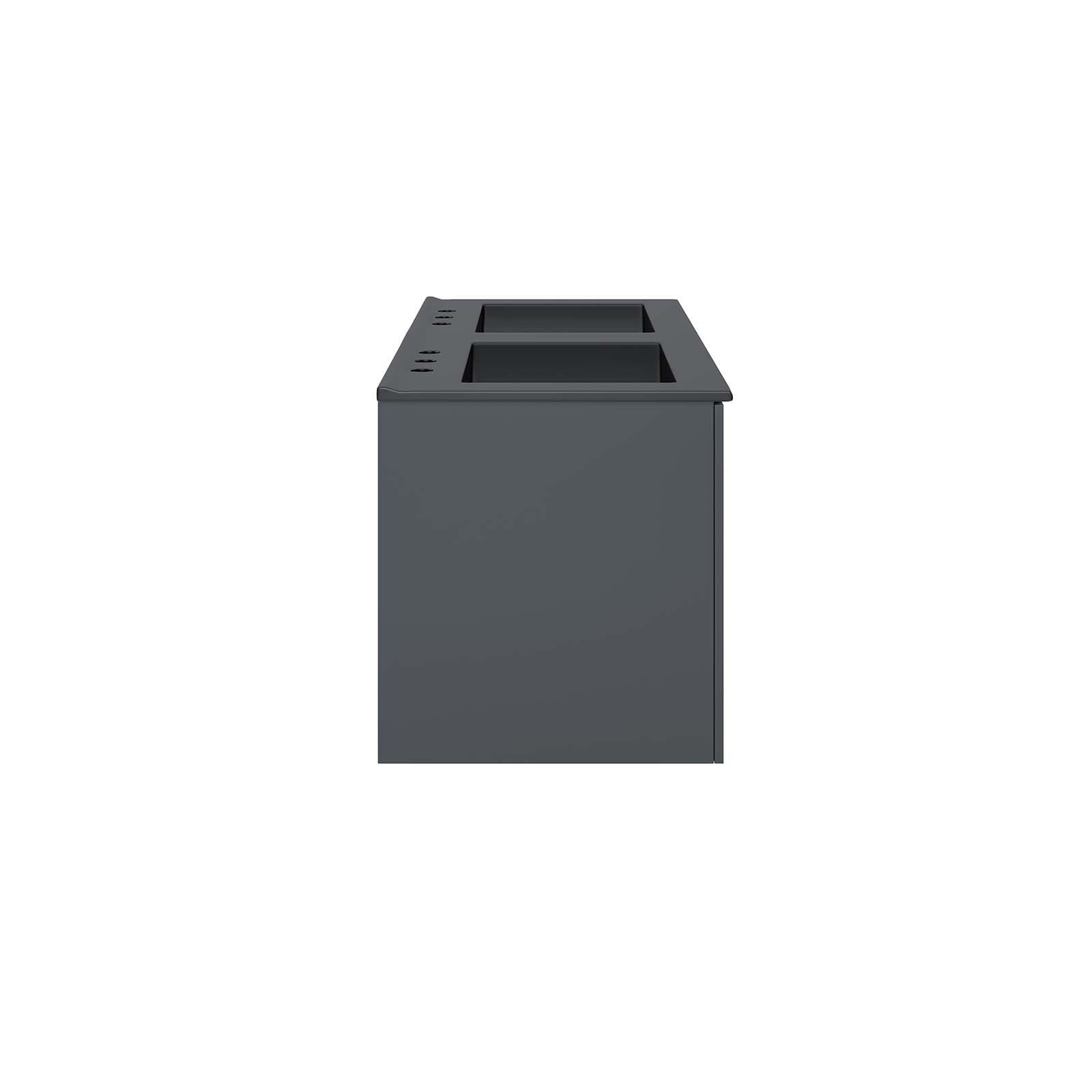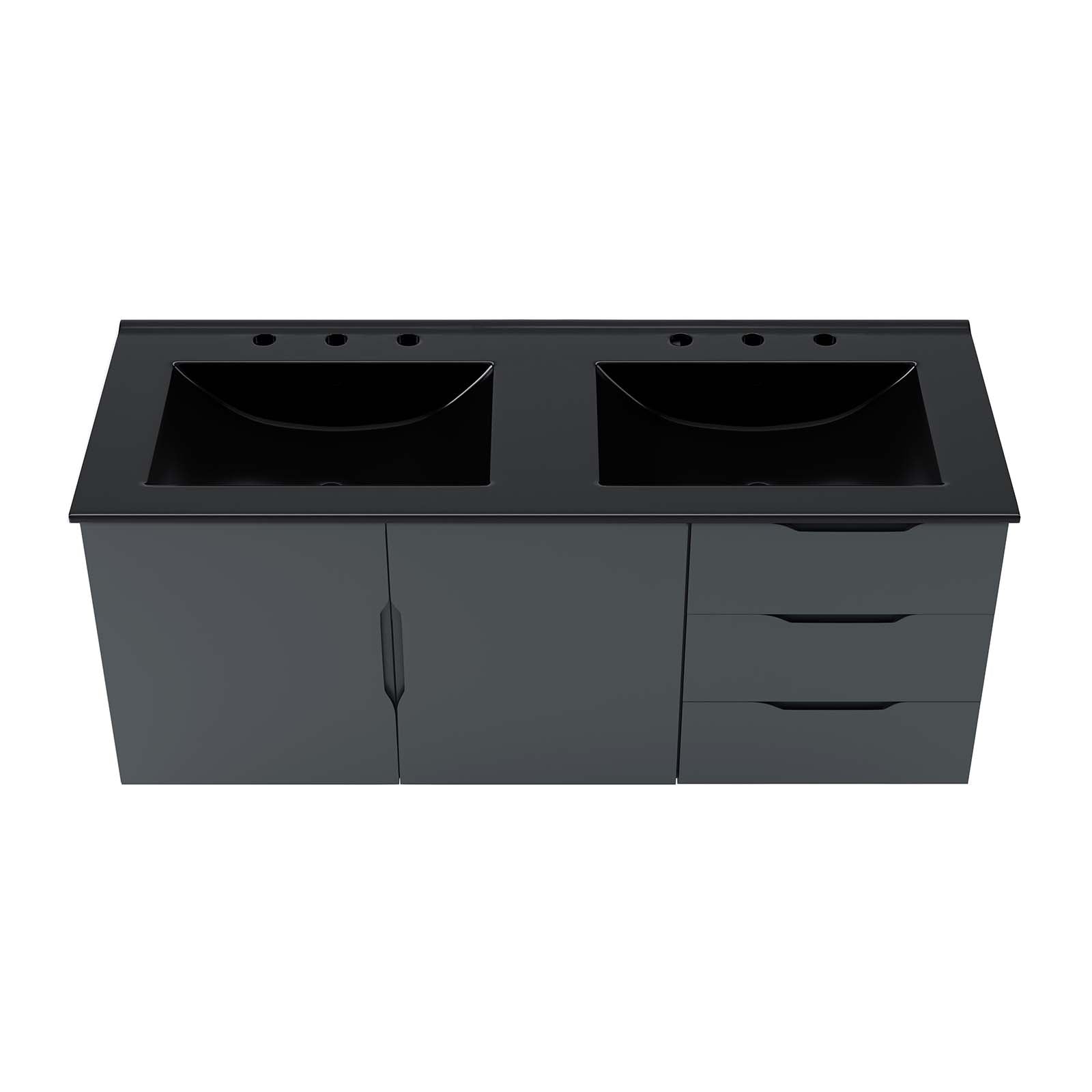 Energize your bathroom space with the modern design of the Vitality 48" Wall-Mount Bathroom Vanity. Boasting a sleek, clean-lined silhouette, this vanity is durably crafted with particleboard and MDF with a melamine finish. This vanity features a wall-mount design and is complete with ample storage space for all your bathroom essentials with two spacious drawers and an under-sink storage area behind two soft-close doors. This vanity is complete with a double sink ceramic basin with 8-inch centerset holes and an integrated countertop. This vanity boasts an open back to accommodate plumbing. Fixtures not included. Assembly required. Set Includes: One - Vitality 48" Double Sink Bathroom Vanity