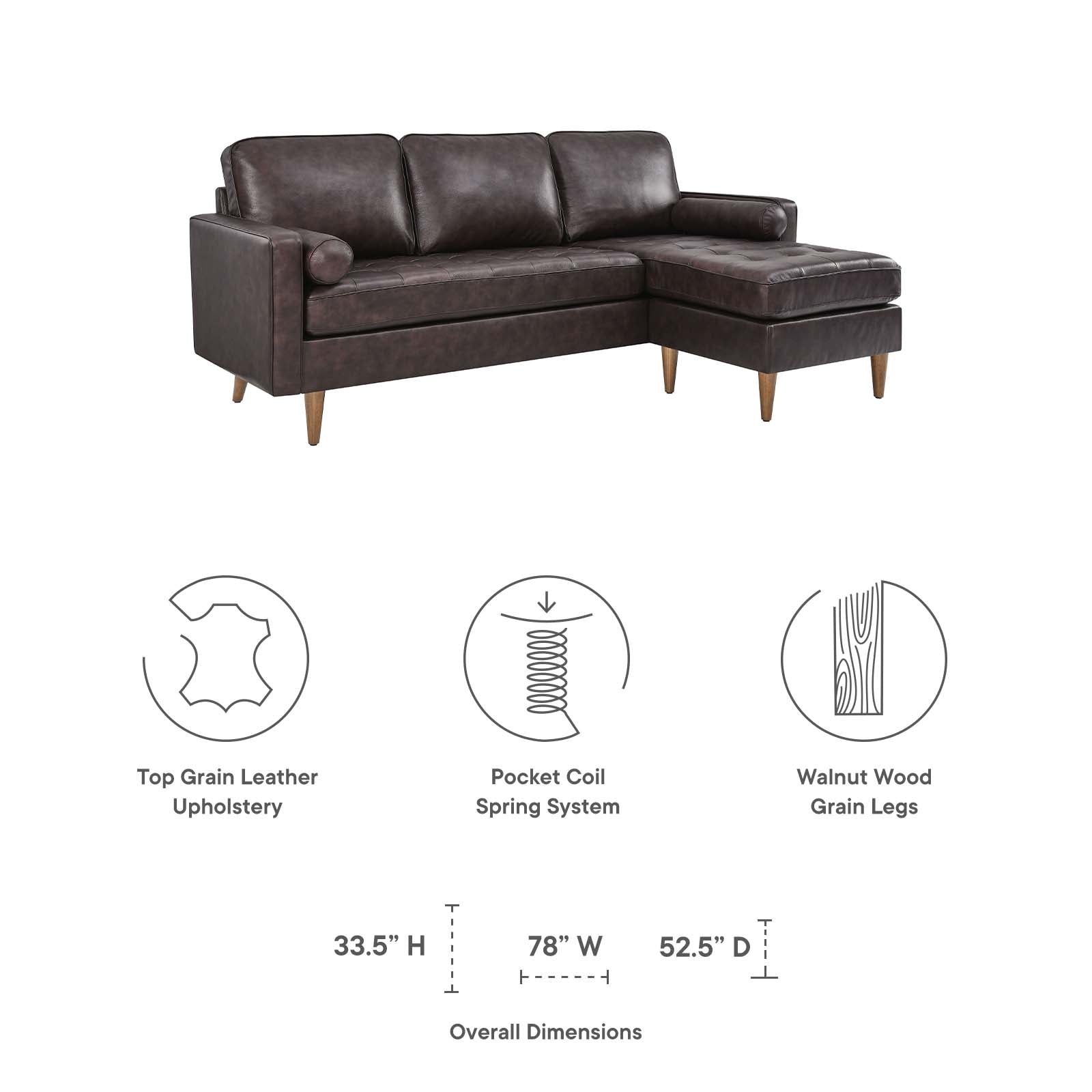 Update your home or apartment with the mid-century style and modern-day convenience of Valour. This comfortable apartment sectional sofa features a tailored profile with elegant biscuit tufting and two bolster pillows. The ottoman can be moved to either side of the 3-seater sofa, making this an interchangeable sectional. Covered in beautiful top grain leather upholstery, Valour has dense foam padding, an innerspring pocket structure, and sinuous spring support for a comprehensive seating experience. This luxe modern sectional sofa comes with walnut-stained wood legs with non-marking foot caps and supports up to 1322 lbs. Say goodbye to the days of hauling heavy furniture. This tufted sofa ships in a portable box for easy maneuvering. Set Includes: One - Valour 78" Leather Apartment Sectional Sofa