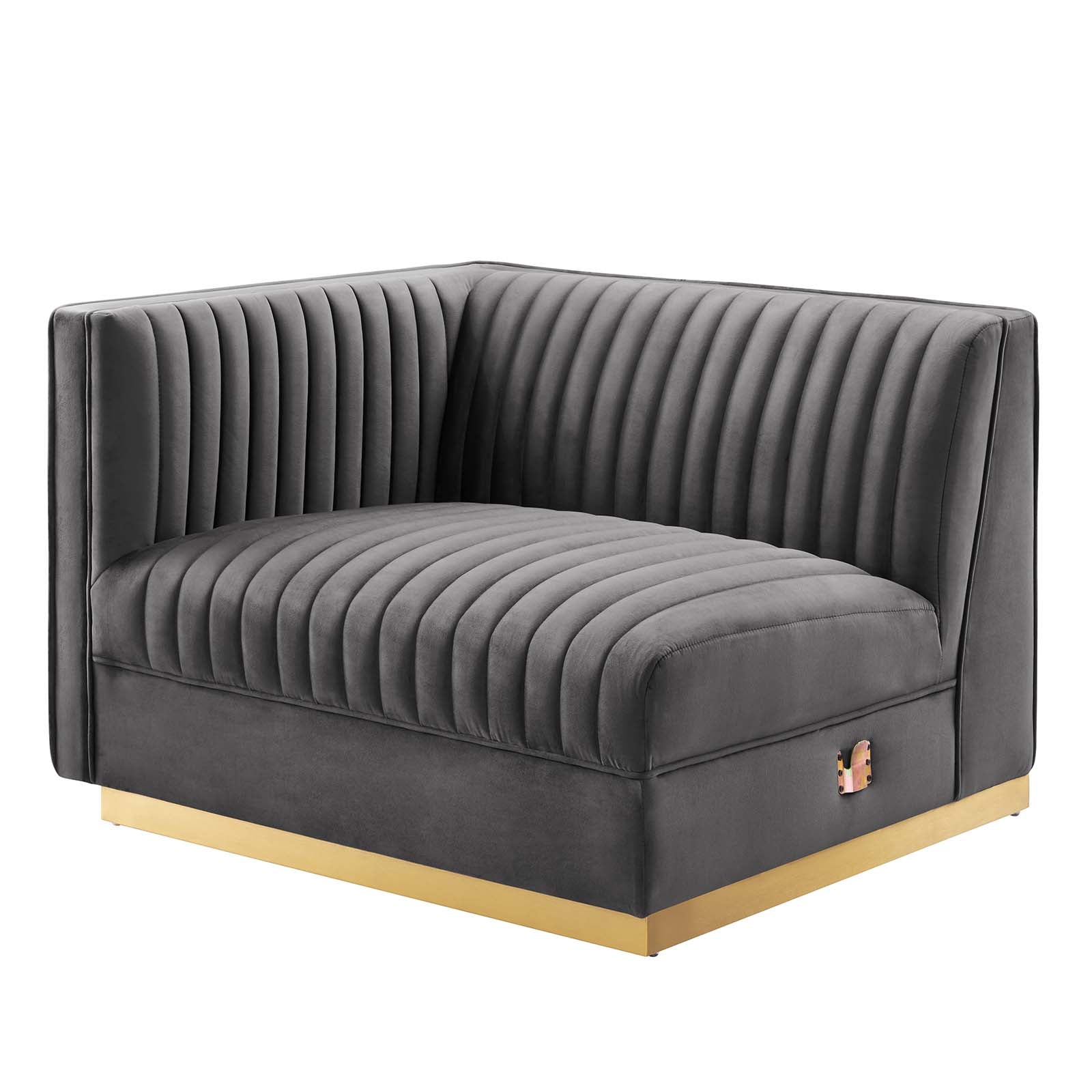 Glamour radiates from the organic linear design of the Sanguine Channel Tufted Performance Velvet Modular Sectional Sofa Left-Arm Chair. Relax and follow the vertical channel tufting for a streamlined look that adds retro modern glamour to your living room, lounge, or home office. Soft, stain-resistant performance velvet upholstery creates a luxurious tactile experience while dense foam padding and an individually wrapped spring coil system provide ultimate comfort and support for this sectional sofa piece. Solidly constructed from eucalyptus wood and plywood, this sectional sofa collection is an eye-catching addition. Sanguine's palatial accents and premium comfort rest securely on a gold stainless steel base that complements any contemporary modern home or apartment. Includes non-marking foot pads to protect flooring. Weight Capacity: 330 lbs. Set Includes: One - Sanguine Channel Tufted Performance Velvet Modular Sectional Sofa Left-Arm Chair