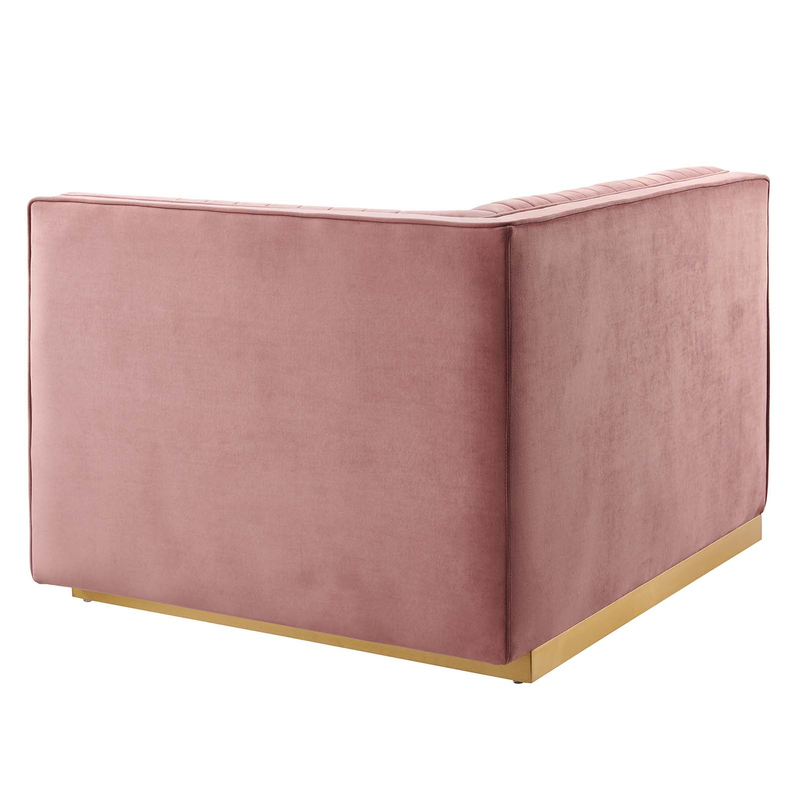 Glamour radiates from the organic linear design of the Sanguine Channel Tufted Performance Velvet Modular Sectional Sofa Right-Arm Chair. Relax and follow the vertical channel tufting for a streamlined look that adds retro modern glamour to your living room, lounge, or home office. Soft, stain-resistant performance velvet upholstery creates a luxurious tactile experience while dense foam padding and an individually wrapped spring coil system provide ultimate comfort and support for this sectional sofa piece. Solidly constructed from eucalyptus wood and plywood, this sectional sofa collection is an eye-catching addition. Sanguine's palatial accents and premium comfort rest securely on a gold stainless steel base that complements any contemporary modern home or apartment. Includes non-marking foot pads to protect flooring. Weight Capacity: 330 lbs. Set Includes: One - Sanguine Channel Tufted Performance Velvet Modular Sectional Sofa Right-Arm Chair