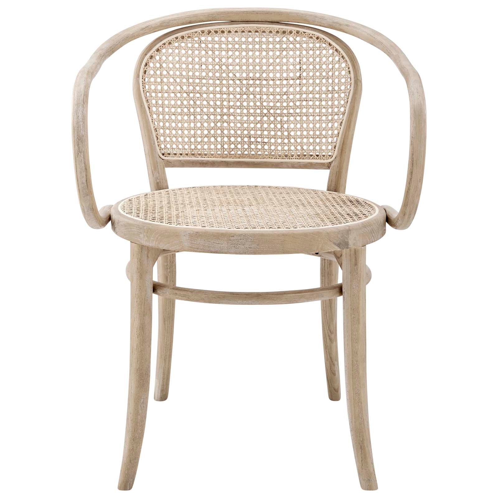 A whimsical addition to your dining space, the Oliana Wood Dining Chair Set blends coastal charm with modern farmhouse style. With a rounded frame crafted from solid elm wood, this side chair set features a woven rattan cane seat and backrest that creates an airy design. This wood chair set is a versatile choice for the modern home, making a statement around the dining table or as accent chairs in the living room, office, entryway, or other seating area. Includes non-marking foot caps. Weight Capacity: 330 lbs. Set Includes: Two - Oliana Wood Dining Armchair