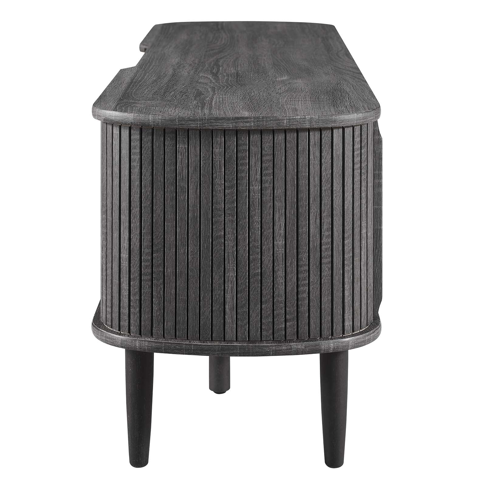 Invite mid-century aesthetics into your living space with the Contour 55" TV Stand. Contour features retro beadboard and an organic silhouette and stands on four tapered legs with two support legs. Crafted with rubberwood, MDF, and particleboard, this entertainment console is complete with a center storage area with an adjustable shelf and open back, as well as two side storage areas with sliding doors to conceal. This media stand accommodates TVs up to 60" and is the perfect modern addition to the living room, lounge area, or recreation room. Assembly required. Weight Capacity: 163 lbs. Set Includes: One - Contour 55" TV Stand