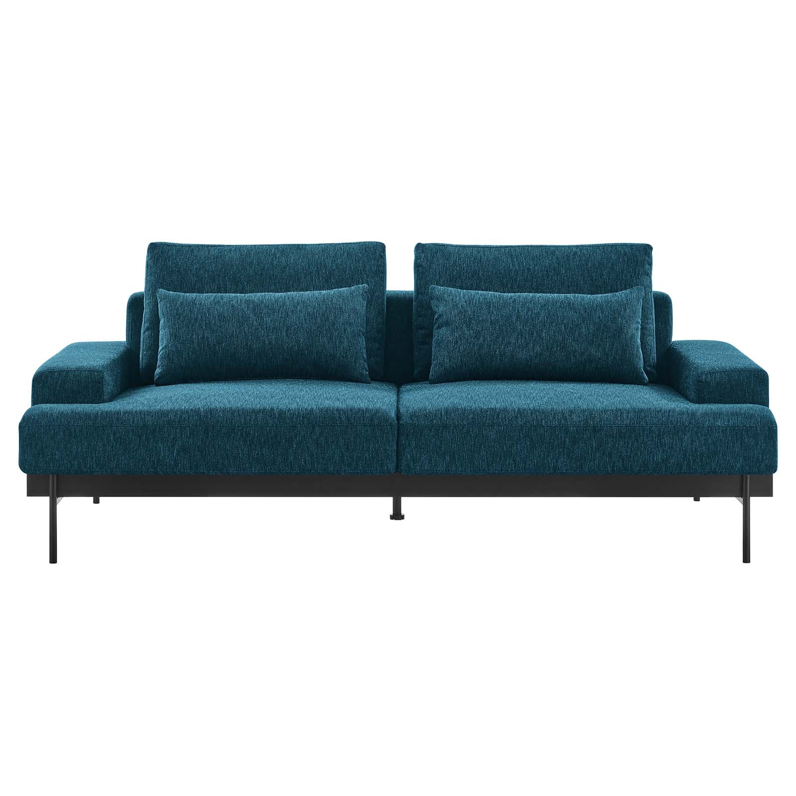 Dive deep into casual design and modern minimalism with the Proximity Fabric Upholstered Sofa. Upholstered in soft yet durable polyester fabric, this sofa features a tailored silhouette, deep, comfortable seats, and sleek lines for a retro modern look that complements a variety of living spaces. Resting on a solid wood frame with powder-coated metal legs and non-marking foot pads, this three-seater sofa is complete with dense foam padding and a sinuous spring support system to offer a premium seating experience. This upholstered sofa is the perfect addition to a living room, lounge area, home office, or bedroom sitting area. Assembly required. Weight Capacity: 992 lbs. Set Includes: One - Proximity Upholstered Sofa