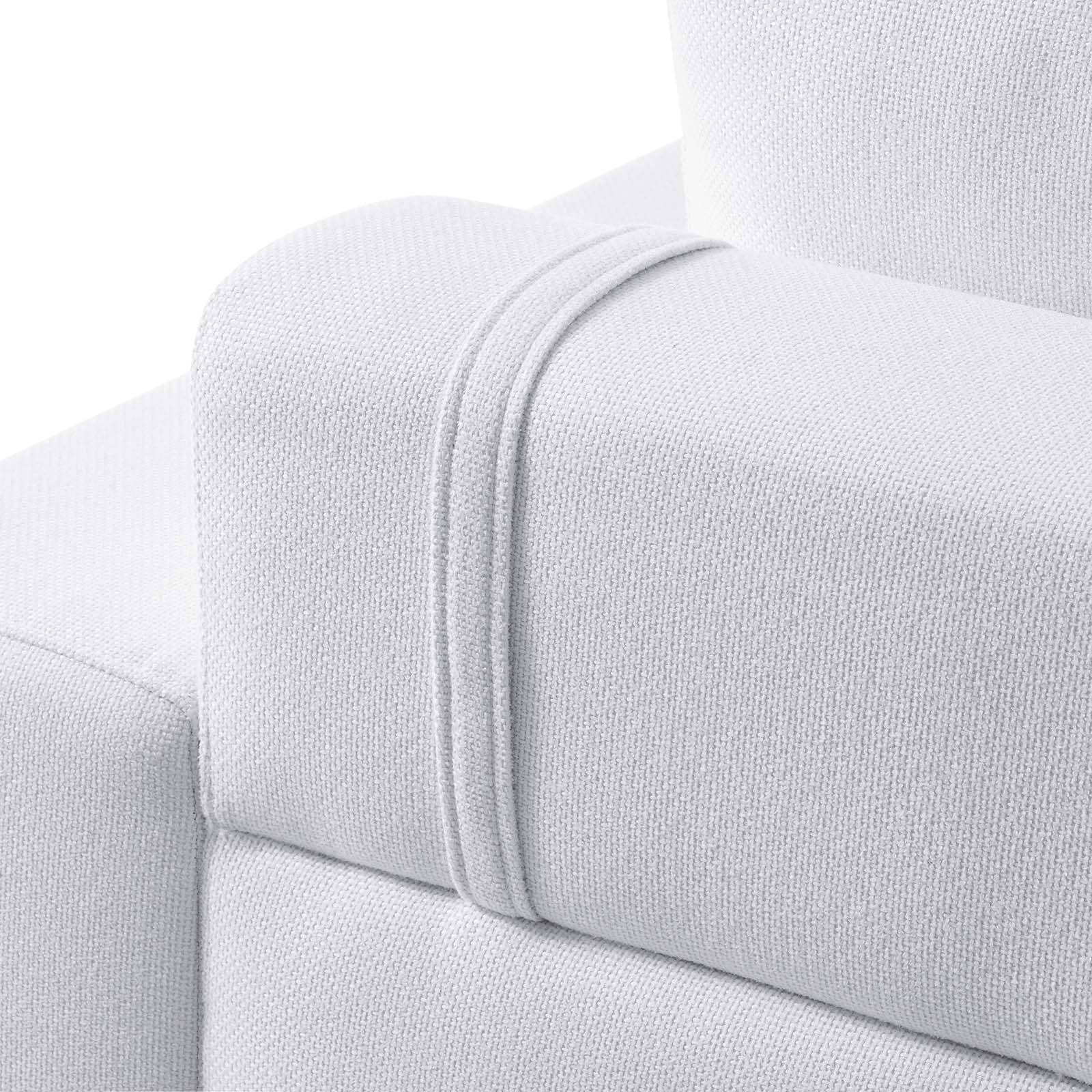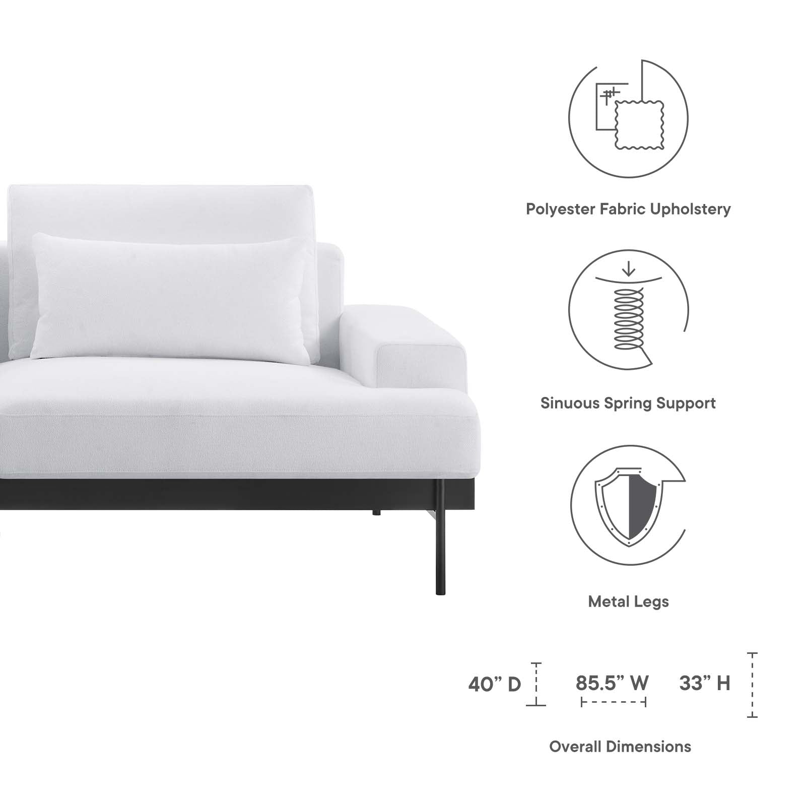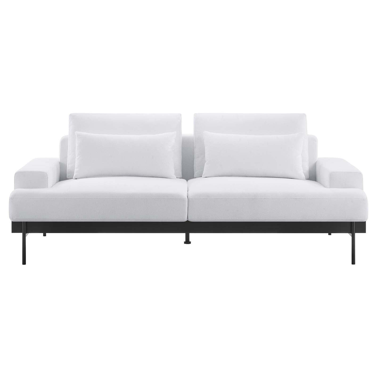 Dive deep into casual design and modern minimalism with the Proximity Fabric Upholstered Sofa. Upholstered in soft yet durable polyester fabric, this sofa features a tailored silhouette, deep, comfortable seats, and sleek lines for a retro modern look that complements a variety of living spaces. Resting on a solid wood frame with powder-coated metal legs and non-marking foot pads, this three-seater sofa is complete with dense foam padding and a sinuous spring support system to offer a premium seating experience. This upholstered sofa is the perfect addition to a living room, lounge area, home office, or bedroom sitting area. Assembly required. Weight Capacity: 992 lbs. Set Includes: One - Proximity Upholstered Sofa