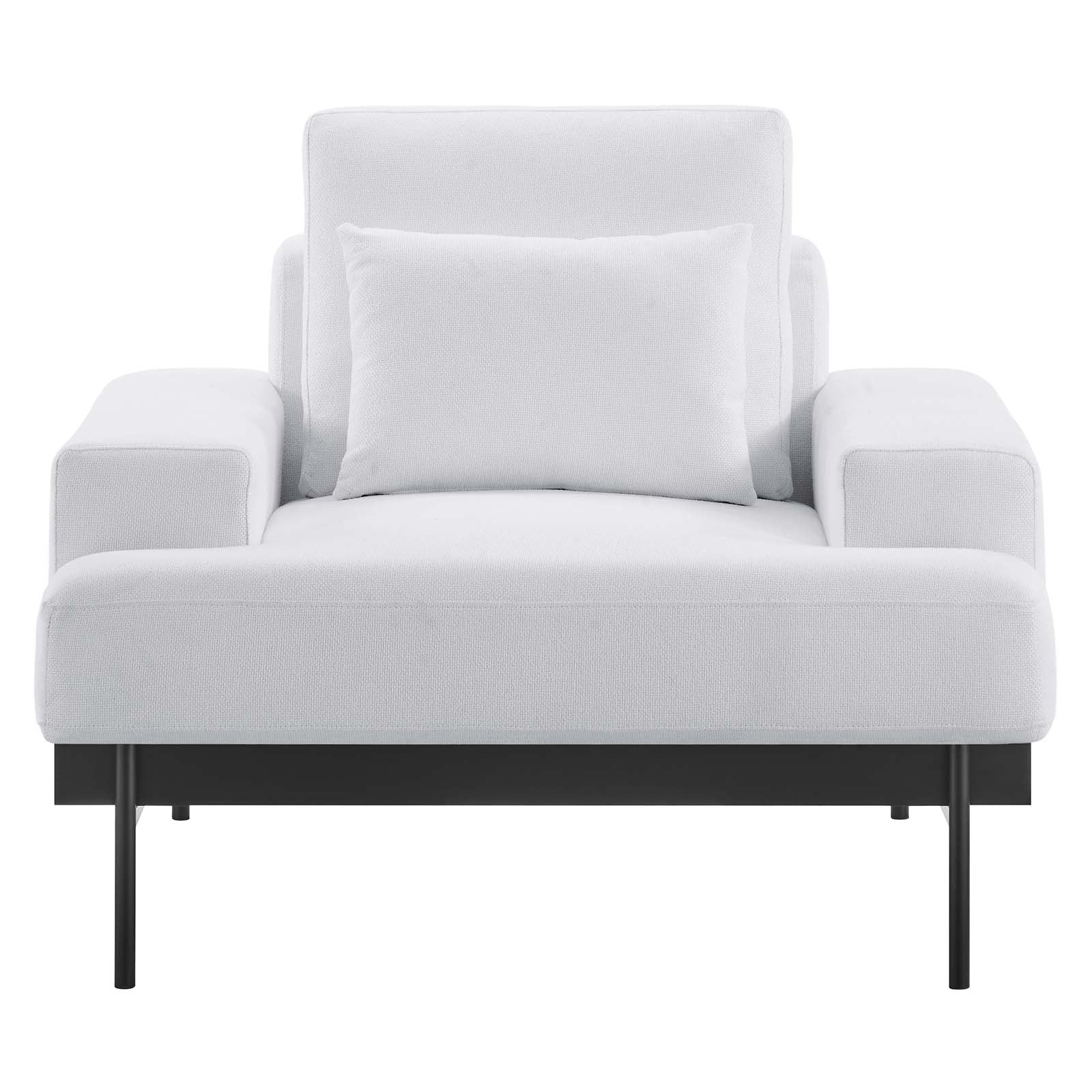 Dive deep into casual design and modern minimalism with the Proximity Fabric Upholstered Armchair. Upholstered in soft yet durable polyester fabric, this armchair features a tailored silhouette, a deep, comfortable seat, and sleek lines for a retro modern look that complements a variety of living spaces. Resting on a solid wood frame with powder-coated metal legs and non-marking foot pads, this accent chair is complete with dense foam padding and a sinuous spring support system to offer a premium seating experience. This upholstered chair is the perfect addition to a living room, lounge area, home office, or bedroom sitting area. Assembly required. Weight Capacity: 330 lbs. Set Includes: One - Proximity Upholstered Armchair
