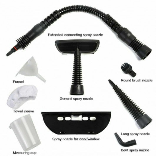 If you are looking for a cleaner that is handheld to use for multiple surface this chemical-free steam cleaner with 9-piece accessories is a good choice for you.The temperature of the steam can reach to 284 �F for clearing away the dirt and stains on the floor doors windows clothes and auto. At the same time these surfaces also can be disinfected and sterilized. When it comes to safety this steam cleaner has three considerate design to ensure safety. To prevent heating empty boiler the machine will disconnect the power supply automatically and the lower lamp will turn off to indicate after heating finished. And the safety valve will automatically open and release pressure when there is high steam pressure in the tank. There is also a safety lock on the handle to ensure safety when the steam cleaner is in use. Use this steam cleaner for all your cleaning jobs. It will be a good helper for your daily household cleaning. If you are looking for a cleaner like this don't hesitate to buy it! The water in tank can be heated quickly in just few minutes The machine will disconnect the power supply automatically to prevent heat empty tank Safe lock and safe cap on the top ensure the safety when it is in using Some of 9-piece accessories can be combined to use according to your different needs Chemical-free to clean the surface with sterilization and disinfecting function Lightweight and portable design for holding and moving easily Large capacity of water tank for long time working and you won't add water again and again With integrated design of heating tubes and boiler body Overall heating is provided high heating efficiency and energy-saving Aluminum alloy die casting boiler body with extra-thick inner wall Resist high pressure and has a long service life Ideal to use this steam cleaner to clean floor window sink toilet auto and so on