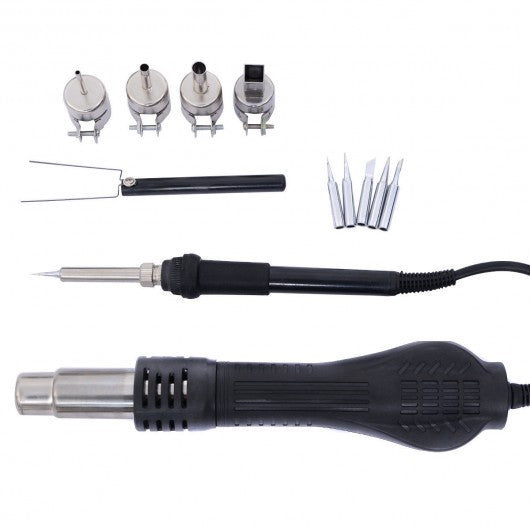 Specification: Model: 862D Voltage: 110V/60Hz Power of hot air gun: 500W Power of hot solder iron: 40W Length of Power Cord: 4ft Length of Hot Air Gun Handle: 3ft Length of Hot Solder Iron:3ft Display Type: Dual LED digital displays Package includes: 1x 2in1 Soldering Station Unit 1x Hot Air Gun 1x Hot Solder Iron 1x Iron Stand 1x Gun Holder 4x Nozzles 5x Welding Nozzles