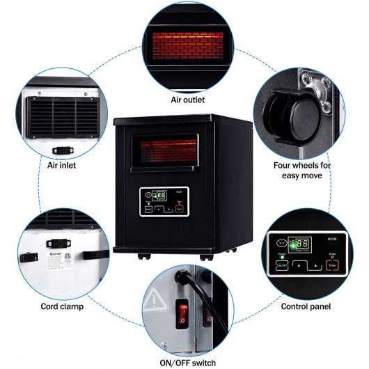Wherever you are and no matter how cold the season this infrared heating system can help keep you warm and toasty. Featured 3 of our quartz infrared elements and a remote control this high-quality highly-efficient portable device will ensure that you are comfortable for hours while saving you heating bills. And it is savings settings that will heat to 86 ?. It is easy to move with its gliding casters from room to room. You will love the warmth you get with this infrared quartz heater. You should keep combustible material such as furniture pillows bedding papers clothes and curtains at least 3 feet(0.9m) away from the front of the heater's sides and rear. Brand new and high quality Electronic temperature controller With remote control LED display for easy monitoring Overheat cut off and tip over protection system
