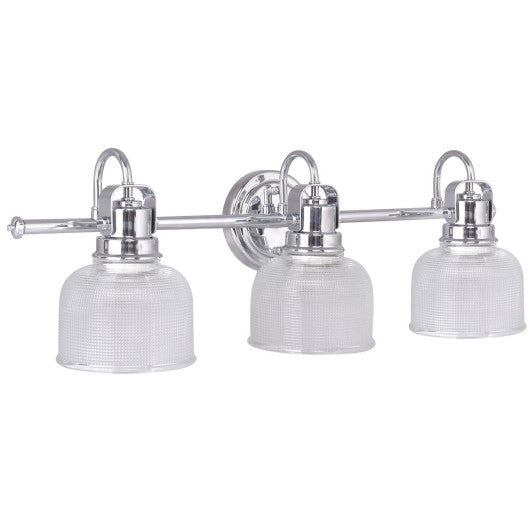This modern and fashionable wall mounted light will bring you warm and soft atmosphere in your bedroom living room bathroom or work places. The vanity light is made of metal with brushed chrome finish and clear prismatic glass fixture which is anti-rustic and looks modern. The 3-light bath vanity light brings you soft and warm atmosphere. Glass is complemented with a crisp and clear edge accent strip. With features of beauty appearance soft lighting easy installation the lamp is ideal for any décor and spaces. It's UL listed so there is no worry about safety. Delivery includes necessary hardware making the installation much easier. The wall sconce lasts long and will company you for years. Welcome to buy one! Contemporary & modern style Made of metal with brushed chrome finish and clear prismatic glass durable & lasting long Multi application: suits 3 x E26*100 W bulbs can be mounted up or down to suit your needs Perfect for bathroom hallway patio it is also ideal for providing functional illumination in task areas throughout your work places Security assurance & easy Installation: Meets UL listing safety and quality standard No bulbs are included ll necessary hardware are included Easy to assemble according to the instruction