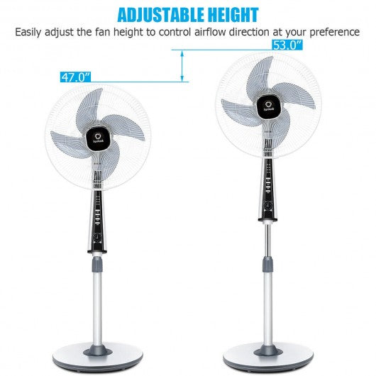 This 15" pedestal fan has four high-performance blades to move a high volume of air wherever it's needed. With 3 wind speed and 3 fan mode you can customize this fan for optimal comfort. The 7.5 hour programmable timer and remote control will provide you with more convenience. The height of this fan can be adjusted to meet your different needs. This oscillating stand fan can make all the room cool and give you a more comfortable and consistent breeze. It will bring you more cool feeling with low noise. Don't hesitate to buy it! 4 heavy duty blades to powerfully circulate the cool air 3 wind speed settings ( Low/middle/high) 3 fan mode ( Normal/Nature/Sleeping) for optimum comfort The height can be adjusted from 47" to 53" Oscillation can make the whole room cool Timer can be set from 0 - 7.5 hours Remote control offer more convenience Great for office bedroom and living room Less power and noise