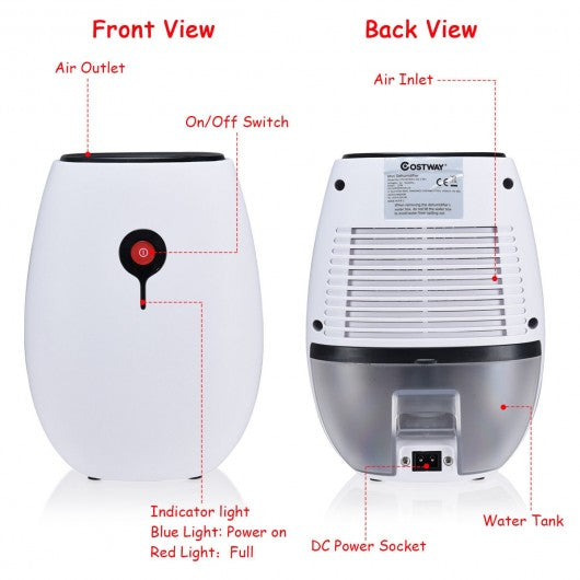Not Available For Sale Or Use in California This mini electrical dehumidifier helps keep your home comfortable and mildew-free. The dehumidifier adopts advanced whisper technology and makes no noise or obvious vibration. It will automatically shut down when the tank is full of water. It is safe to use and easy to move. This dehumidifier effectively helps eliminate moisture and fungus allowing you to breathe healthy and fresh air. The water tank has a maximum capacity of 500 ml. It is ideal for rooms that's around 150 square feet like bedrooms kitchens bathrooms storerooms living rooms and offices If you are looking for such product don't hesitate to buy it now! A large air inlet to remove the moisture efficiently in the air upmost to 220 ml water per day Adopts advanced whisper technology without a compressor make less noise which is about 35 dB Automatically shuts off when the tank is full of water stops working and the indicator LED light will turn to red Easy to be moved from room to room and saves up lots of space