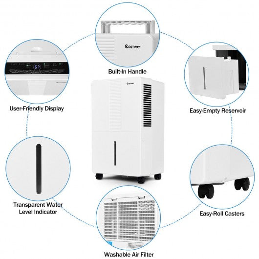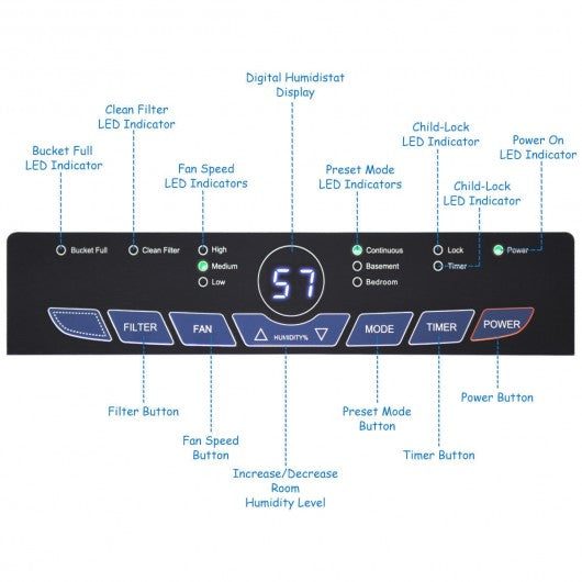 Not Available For Sale Or Use in CaliforniaThis 70 pint dehumidifier is a compact and portable unit with great performance. It is ideal for the basement attic or other unusual environment usage. With continuous humidifying options robust customizable settings and a user-friendly touchscreen it quickly and effectively reduces odor and bacteria and removes up to 70 pints of moisture from surrounding humid air per day. This dehumidifier will give you better home environment. If you are looking for a dehumidifier don't hesitate to buy one! Diverse: It can be used in cooking laundry bathing and dish-washing areas that have excessive moisture. It is great for preventing moisture damage books or valuables Better home environment: It protects your home from mold and mildew caused by excess moisture. Removable washable filter reduces bacteria room odors and other airborne particles for a healthier more comfortable environment Humidity control: It is capable of extracting up to 70 pints of water per 24 hours and allows you to control the amount of humidity in your room for maximum comfort. The bucket capacity is 17 pints Easy and safe to use: It features with ready-select electronic controls with digital humidity readout 24-hour on/off timer 3 speed fan (High/Med/Low) and child-lock. It automatically shuts off when the bucket is almost full Easy to move and storage: The compact and lightweight dehumidifier is easy to carry and storage and fits discreetly in most spaces. 4 caster wheels make it easy to move your unit from room to room