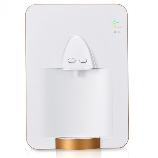 Specification: Material: ABS plastic Color: White + Gold Product dimensions: 12" x 5" x 16"(L x W x H) Power supply: 110-120/60Hz Rated power: 580 W Water tank capacity: 2 L Hot water capacity: 1.4 L Applicable ambient temperature: 40℉-105℉ (5℃- 40℃) Warm water flow rate: ≥ 1.2 L/min Hot water flow rate: ≥ 1.0L/min Rated heating temperature: ≥195℉ (≥90℃) Rated heating capacity: 5L/h Inlet pressure: 0.1-0.4Mpa Package include: 1 x Wall-mounted water dispenser