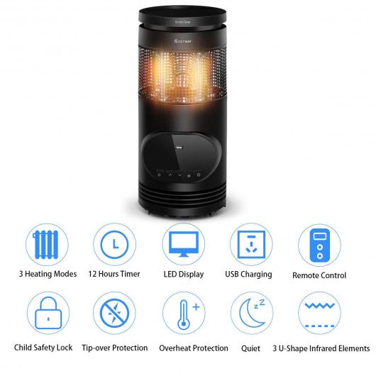 Take the chill out of the air in your home and lower heating bills in the process with this digital quartz infrared heater. This heater features 3 U-shaped wrapped quartz infrared elements and uses up to 1500-Watts. There are 3 heating settings including an Eco setting that will heat smaller areas to 68 degrees. The lightweight heater design with a carry-handle which makes it easy to carry from room to room to enjoy the benefits of zone heating. This compact heater also includes a remote control providing more portability. Timer settings can be used to turn on or off the heater up to 12 Hours ahead. If you consider buying a heater you'll be definitely satisfied with it. Don't hesitate to buy it! Exceptionally quiet operation makes the heater perfect for any room Ideal for full room such as offices bedrooms and living rooms High/low/Eco 3 modes to satisfy your needs ECO mode will keep the temperature maintain a constant 68�F to save energy Built-in 3 U-shaped quartz heating elements fast heating Control panel to set the temperature (50 - 90�F) Equipped with a remote control convenient to adjust indoor-temperature Designed with a timer function from 1-12 hours LED display screen shows the data of the heater clearly Features an overheat and tip-over safety protection for safety Child lock gives your more safety Carry-handle and lightweight design easy to move With a USB charging port
