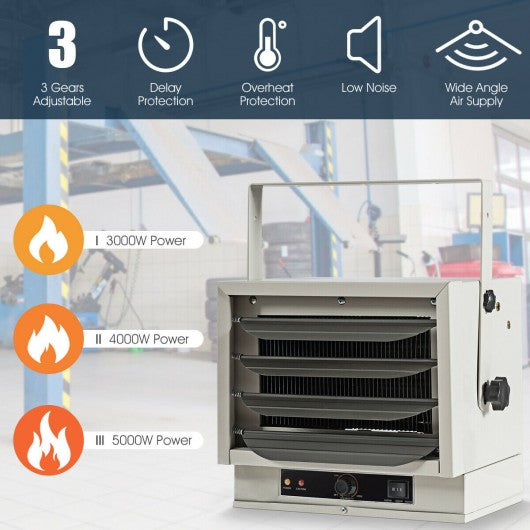 This is the heater which is suitable for your workshop warehouse and garage! The heater with supporting bracket can be used on the ground or on the wall to meet your different needs. And low noise design will not disturb your family. Because of thermostat and thermal cutout the heater will automatically turn off when the temperature is overheated. Once the temperature returns to normal the heater will be opened again to help you save energy while protecting your safety. Don't hesitate to buy it! Made of premium steel construction for years of use 3 adjustable power levels (3000-4000-5000 watts) to meet you different needs Heat output ranges from to 11 285 btus per hour to 17 065 btus per hour Two ways of use for suspending on the wall or placing on the ground 3-minute delay protection to help the heater dissipate heat effectively 4 louvers can be manually adjusted up and down to guide the air flow Overheating protection for automatically turning off the heater if the temperature is too high Noise less than 50 decibels will not affect your daily life Electric heating will not produce flame for safe use Keep combustible materials such as bedding clothes and curtains at least 3 feet ( 0.9 m ) from the front of the heater Ideal for indoor use only but not intended for use in bathrooms laundry areas and similar indoor locations Suitable for factory workshop warehouse garage and more Certificated by etl to guarantee go