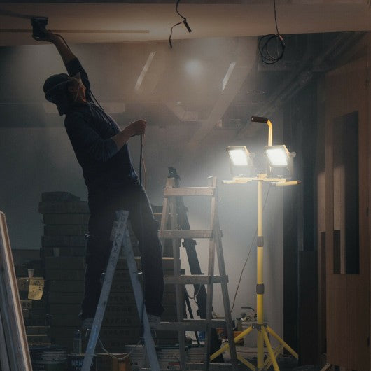 This LED work light can be used in your garage shed basement or workplace wherever you need light outside. As a waterproof outdoor work light you don't have to worry about it being damaged by the weather. The work light Includes two 30W bulbs a 9ft power cord and an adjustable tripod making it ideal for construction work. You can easily detach the lights from the tripod to use the light alone. And the foldable design makes transportation and storage easy and convenient. Adjustable knobs also provide you with the ability to rotate the light by up to 270� vertically and 360�on the axis. This dual-head LED work light is a perfect tool for outdoor lighting! It comes with a sealed die-cast aluminum housing and impact-resistant glass cover The iron pipe bracket with rubber feet guarantees its stability Easy to disassemble when detaching the lights from the tripod 9ft power cord with grounding plug for more convenient use Ultra-high brightness effect The upper part of the frame can be removed and used independently The bracket's height is adjustable (up to 68") Waterproof IP65 is ideal for outdoor use Separate power switch per lamp for more convenient use The quick-release system detaches lights from the tripod High-output dual 30-watt led work light provides a bright 6000-lumen output 5 000k color temperature for maximum visibility LED work light has ETL certification