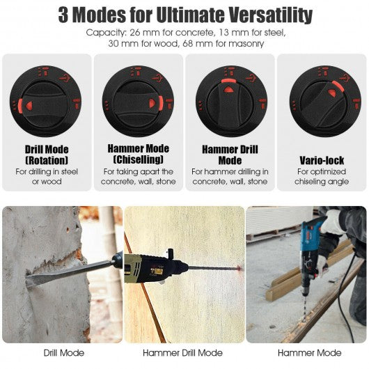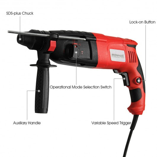 The hammer drill has a powerful copper motor with 0-4000/min impact rate and 1100 r/min no-load speed to quickly accomplish all kinds of work. This 3-in-1 electric hammer drill can effectively complete your work projects. 3 functions including drill mode hammer mode and hammer drill mode can apply to different working tasks with variable speed trigger to control the suitable speed by yourself. And it has a special reverse and forward switch and SDS-plus quick change drill chuck for better operation. Full drill set with 360� rotation auxiliary handle and detachable depth rod give you a lot of convenience to make the work more precise and easier. Combine with so many advantages it is worth buying. If you are looking for hammer drill don't hesitate to buy one. 3 functions to switch from drill hammer drill hammer to be more multi-functional Heavy-duty copper motor is more durable and powerful 360�rotating auxiliary handle to operate easier and can be removed for different needs Detachable scaled depth gauge to decide precise drilling depth Light weight and ergonomically designed handle to reduce fatigue when holding Variable speed can be controlled by your own finger Bidirectional switch can make drill forward or reverse to remove stuck drill A lock-on button can hold on the operation for to make it easier SDS-plus quick change drill chuck has maximum impact energy transfer Safety clutch can protect the tool will guarantee the user's safety UL-certificated ensures the better quality Full drill set can meet overall needs