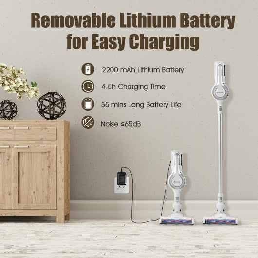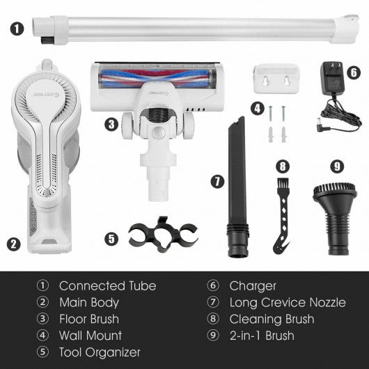 Specification: Color: White + Silver Material: Aluminum Tube ABS Overall size: 9" x 8.5" x 42.5"(L x W x H) Net weight: 5 lbs Power suction: 12 kPa / 9 kPa Battery: 22.2V/2200mAh Charging time: 4-5 hours Battery charger output: 26.5V/500mA Working time: 35 min (low speed) 20min (high speed) Power: 120 W Adapter input: 110-120 V / 60 Hz Dust cup capacity: 0.8L Noise: ?65 db Package includes: 1 x Main body 1 x Connected tube 1 x Floor brush 1 x Long crevice nozzle 1 x 2-in-1 brush 1 x Tool organizer 1 x Cleaning brush 1 x Charger 1 x Wall mounted tools 1 x User's manual