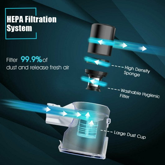 This hand-held rechargeable vacuum cleaner solves the problem of not being able to move freely when using a wired vacuum cleaner. It offers 2 adjustable power modes. The powerful suction of up to 12 kPa can easily suck away pet hair dust and crumbs. When you press the button on the handle you can easily clean your home without soiling your hands. It can give you a quiet and excellent cleaning experience. The 6-in-1 versatile design meets your cleaning needs from ceiling to floor keeping your home and car clean. HEPA filtration system can filter out 99.99% of dust and expel fresh air. And it can be used for 35 minutes after charging for 4-5 hours. Let this vacuum cleaner help you do housework happily in comfort. Equipped with a floor brush a long crevice nozzle and a 2-in-1 brush to meet multiple cleaning needs Provide 2 different power modes of 12 kPa and 9 kPa 120?rotating brush can clear hard-to-reach areas Built-in LED lights can help you illuminate the dust Metal filtration system and HEPA filtration system for better separation of particles and dust 2200mAh detachable lithium battery can run for 35 minutes every 4-5 hours of charging Wireless design and lightweight body ensure that you can easily clean the ceiling Low noise design ensures quiet use without disturbing home sleep The tool organizer can effectively prevent the loss of accessories Transparent and washable dust cover can check the dust capacity and clean up in time Wall-mounted design does not take up space It has UL and FCC certifications making it safer to use