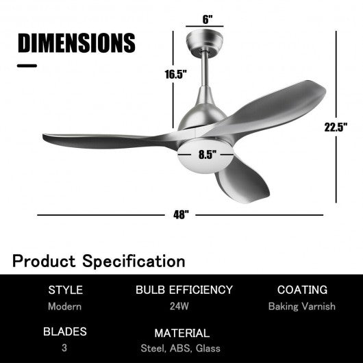 Specification: Color: Black/white/silver Material: ABS glass steel Product dimension: 48'' dia. x 22.5'' H Canopy diameter: 6” Net weight: 14 lbs Bulb efficiency: 24 W Number of fan blades: 3 Switch: remote control Package includes: 1 x Ceiling fan 1 X Remote control 1 x Accessory bag 1 X User guide