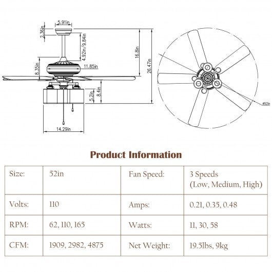 Specification: Color: Bronze Material: Steel MDF Diameter: 52" Blade size: 20.5” x5.5” (L x W) Glass shade Size: 5” x 6” (φ x H) Down rod length: 5"/10" Net weight: 19.4lbs Gross weight: 24.2lbs Voltage: 120V 60Hz Power: 9W/26W/67W (low/medium/high speed) Bulbs: 3 xE12 xMAX40W (Not included) Package includes: 1 x Ceiling fan 1 x Instruction