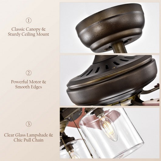 The ceiling fan in bronze is the perfect addition to your room serving up adequate air flow moderate light as well as a fresh take on a classic style. Specially designed with pull chain control our fan is easy for you to adjust the speed and switch the light at will. Since the reversible blades you can enjoy a comfortable air flow under the energy saving fan in summer and winter. 2 color of the wood blades offer you a choice between elegant between white oak and classic walnut both equally complementing the different housing finishes. Its size makes it a perfect match for any room decorations such as living rooms bedrooms kitchens entertainment rooms etc. If you are short of such versatile indoor furniture our reversible ceiling fan will be a great choice! If you are looking for a ceiling fan like this do not hesitate to place an order! Reversible blades deliver downward/ upward wind for air circulation 3 adjustable speeds provide different strengths of breeze as needed Easy-to-use pull chain control makes speed shift & light switch a breeze 2 replaceable downrods are suitable for different ceiling heights 3 clear glass lampshades cast bright light (bulbs are not included) Step-by-step instructions & labeled parts make assembly easier Bronze finished fan with wood blades fits various decoration styles