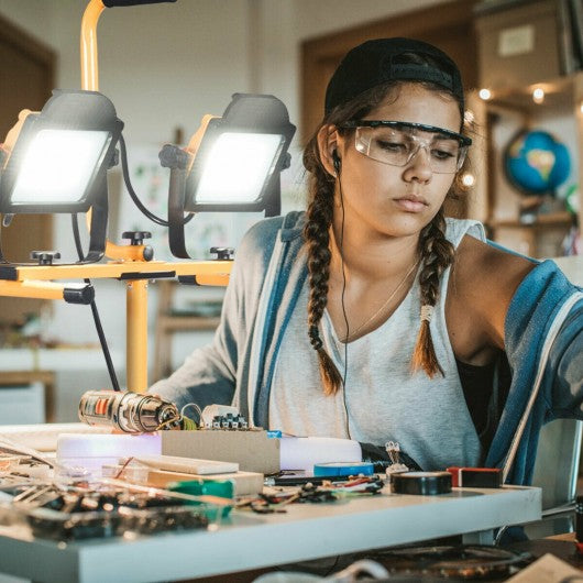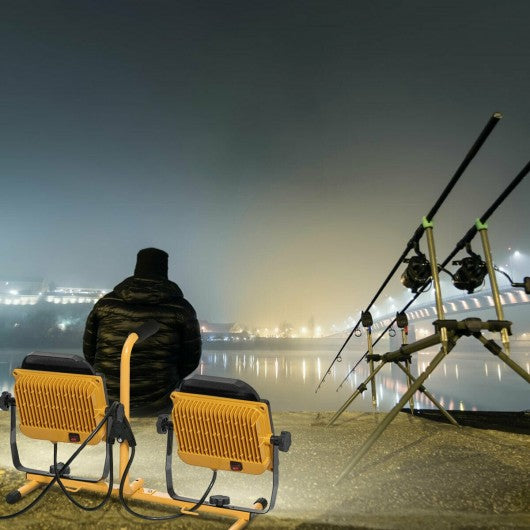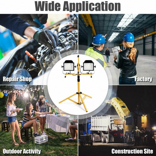 This work light with adjustable tripod stand emits powerful lights to light up dark environment which is ideal for camping trips RV trips parties and family nights etc. Made of premium iron and cast aluminum this work light is sturdy and durable for a long life span with 20 000 lumen brightness for up to 50 000 hours. Led lights can rotate vertically and horizontally on the axis and also can be taken off for precise lighting. You can adjust height of tripod stand to meet different needs. Besides the stand is foldable for easy transportation. Featuring IP65 protection grade it's suitable for both indoor and outdoors. 20 000lm Led lights offer powerful illumination Emits 5000K color temperature natural white light Adjustable height to meet different needs Led lights can rotate 270° in verticality and 360° in horizon IP65 protection grade suitable for indoors and outdoors Detachable top frame for precise lighting Premium iron and cast aluminum for better durability Comes with 3 anti-skid feet pads for better stability Foldable tripod stand for convenient transportation ON/OFF switch of each light simple to operate Maximum Led working time up to 50 000 hours Tempering glass covers protect the lights Reliable with ETL and FCC certification 9 feet power cord enlarges reachable scale Quickly set up in minutes Widely accepted in construction sites camping family evenings etc.