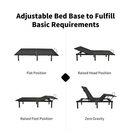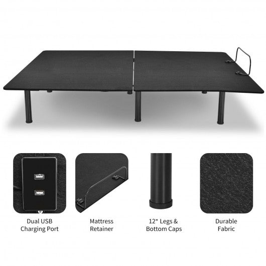 Find your most comfortable posture on our adjustable bed base. The position of head and foot can be independently or synchronously changed. You can choose the most comfortable angle as you need like zero gravity position which is convenient for you to work on a laptop watch TV or reading a book on the bed. With remote control you can choose between 6 buttons to adjust the bed base. Besides the construction of the bed frame is made of heavy-duty steel for extended durability while the cover is crafted with durable fabric for long-term use. Moreover the dual USB ports provide you with great convenience. And it also has a retainer bar to guarantee the mattress stays in place. Heavy-duty steel structure with strong weight capacity The back can be flexibly adjusted from 0 degrees to 70 degree The foot part of the bed base is adjustable in 0-45 degree Wireless remote control for easy operation Powerful motor underneath the bed for quiet operation Fit into most standard size frames Dual USB charging ports convenient use Comes with reset button Retainer bar to fix the mattress Folding design to save space Easy to install without any tool