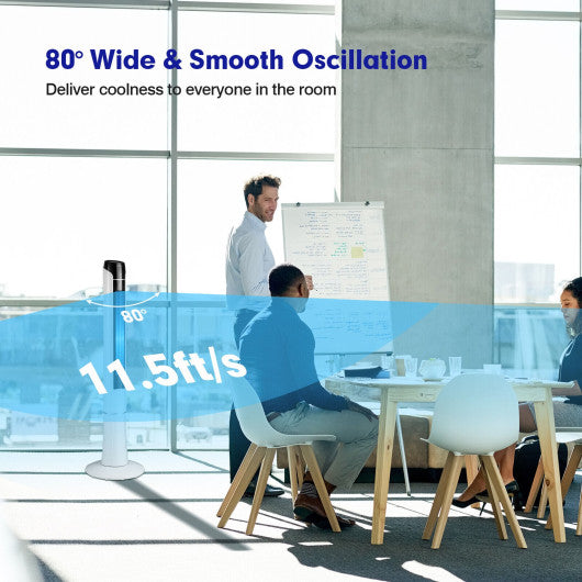 Enjoy a cool summer with this 80˚ oscillating standing tower fan! This lightweight bladeless tower fan combines multiple functions into a compact and energy-saving design which is perfect for the living room bedroom dining room office and more. 3 wind modes and 3-speed settings allow you to customize your desired airflow. Thanks to the 80° wide oscillation the cool and fresh air flow will be delivered to every corner of your room. The low-noise operation and smart 0-15h timer can bring you a comfortable and quiet all-night sleep. It is a perfect match for your air conditioner to promote air circulation effectively in your room while saving energy. With the built-in handle you can move the tower fan anywhere you want effortlessly. Just click the remote or touch the control panel and enjoy the refreshing and cooling breeze! If you are looking for such a fan do not hesitate to take it to your home! 3 fan speeds for you to choose from low to medium to high 3 wind modes include normal mode natural mode and sleep mode 85° oscillation expands the airflow coverage to cool down the whole room 53dB low-noise operation won't disturb your sleeping or working 15H timing function allows you to enjoy a worry-free and cool summer night A perfect match for your air conditioner to save energy and promote air circulation Clear LED display screen and remote control for convenient use Rear built-in handle for easy carry and remote control storage Compact design saves plenty of floor space The spacious round base greatly increases stability ETL certification and overheat protection ensure high security Widely used in the living room bedroom dining room office etc