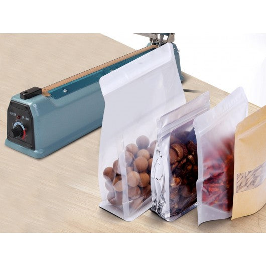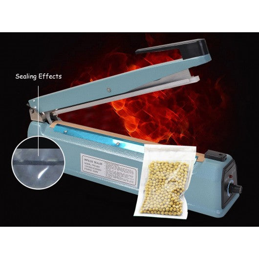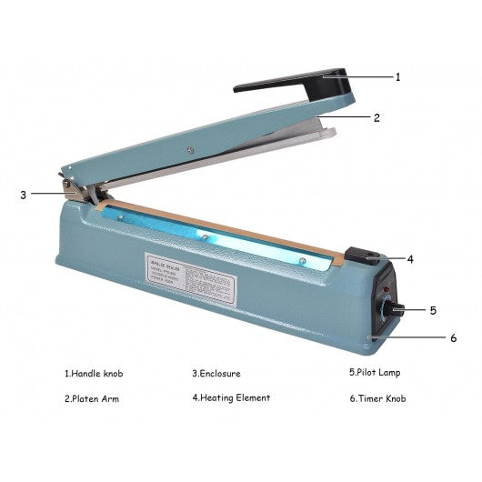 This useful sealer machine is a perfect choice for you to deal with all kinds of sealing works. This very easily operated 12" impulse bag sealer is necessary help in every case when there is anything to be packed or bags to be sealed. With its adjustable timer it will reach different plastic needs. The desktop machine will be able to produce adequate heat to effectively melt the plastic material on the bag for optimum sealing. If this happens to meet your expectation just bring one back home. Precision electronic control circuit Portable and compact size Metal case Impulse sealing for power-saving 12" long sealing element Adjustable timer creates perfect seals for varying bag thickness Labor-saving design with long handle Low power consumption