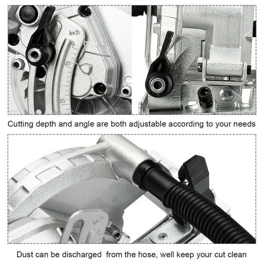 Specification: Color: As the pictures show Voltage: 120 V/60 Hz Power: 705 W Load speed: 3500 RPM Net weight: 6.5 lbs Blade diameter: 4.5'' Max cutting depth at 90�:1-11/16" Max cutting depth at 45�: 1-1/8" Level capacity: 0~45� Package includes: 1 x Compact circular saw 1 x 24 Carbide-tipped teeth blades 1 x Guide rule 1 x Vacuum adaptor 1 x Allen wrench 1 x User maual