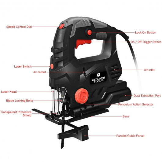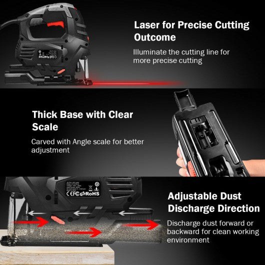 This professional jigsaw is a good helper to cut different material with great precision. It features tool-free blade change system so that the blade can be changed in second. There are 6 blades one hidden inside the blade storage box of the jigsaw fulfilling different cutting requirements. Laser and scale ruler ensures precise cutting line. 4 Orbital settings are compatible for wide range of materials while the 45� bevel cutting for versatile use. Equipped with high quality chopper motor it delivers up to 3000rpm cutting power. And 5 variable speeds can be applied to different materials as well. Less hand fatigue thanks to the ergonomic handle design is beneficial to you in higher work efficiency and comfortableness. Secure the tool in the tool box and carry it around anywhere you want. Fast and tool-free blade change system with 6 blades available Maximal cutting depth for wood: 80mm metal: 10mm High quality motor delivers up to 3000rpm 5 Variable speeds for different cutting requirement 4-Position orbital setting fulfills the different cutting requirement of various materials Use the hexagonal wrench provided to adjust bevel up to 45� both right and left Built-in laser function and a scale ruler for higher cutting accuracy A blade is hidden inside the blade storage box of jigsaw machine Adjustable dust discharge direction forward or backward Dust port allows it for connecting with vacuum for effective dust extraction Ergonomic anti-slip handle provide comfortable grapping feeling Sturdy tool box secure tools for convenient storage and portability
