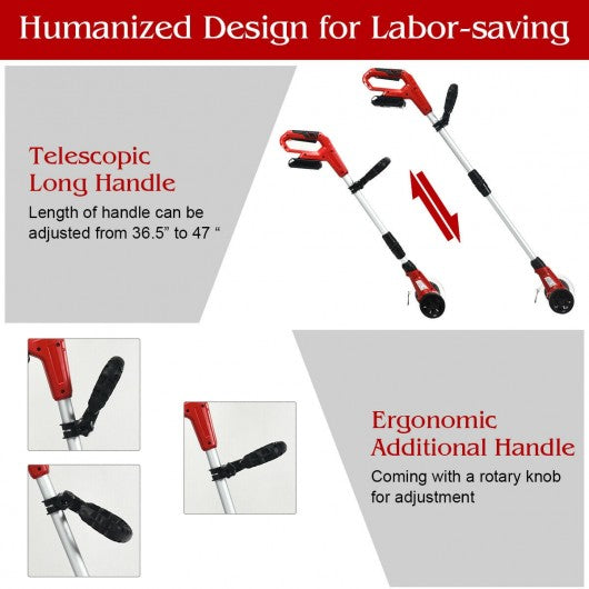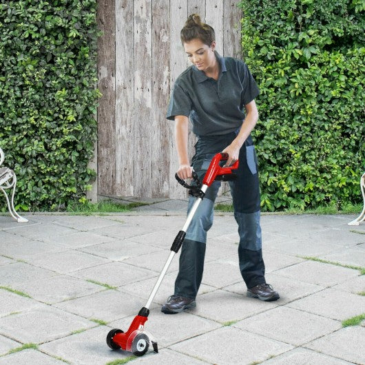 It is easy to clean moss grass and unwanted debris from pathways and paving with our cordless string trimmer. Driven by an 18V lithium-Ion battery the cleaner will provide the freedom and usage for up to 35 minutes after a single charge between 3-5 hours. What's more this weed sweeper is sturdy and durable for long time use because of the premium ABS shell. 2-button actuation and non-slip handle ensure you don't get hurt in the process. This string trimmer combines with the efficient motor brush and a guide wheel can provide you with high-efficiency cleaning result. And the length of extension pole can be adjusted within 36.5" - 47" to meet your different cleaning need without stooping or bending. Featuring with a nylon brush and a steel brush this string trimmer is suitable for different situations. If you are looking for this product don't hesitate to place an order! This product is not for sale in California. Built-in lithium-ion battery with large capacity for long time use Equipped with nylon brush and steel brush for multiple trimming tasks Best used for small gardens backyard and hedge cleaning Cordless operation will not limit working area Guide wheel for smooth moving and laborsaving Lightweight ABS material & compact construction for easy carry Safety lock and plastic guard hood for security Tool-less and quick battery change for convenience & efficiency Lightweight design with adjustable handle for easy control and handling
