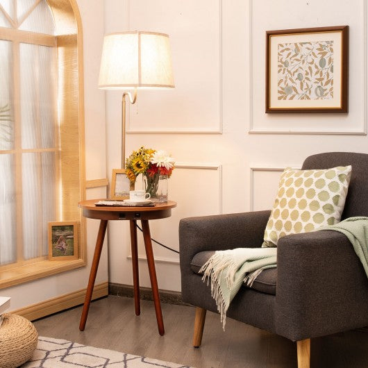 This floor lamp end table will be a fabulous companion of your daily life. Do you always worry that the side table possesses no placefor the lamp? Do you often run out of power on your mobile phone but don't have a charger around you? This floor lamp end table will perfectly solve these problems. Innovative 3-in-1 design of this table will simplify your complex daily life. And 3 charging modes help you easily tackle with charging problems. With this floor lamp table by the side you can enjoy the gentle brightness and fetch things at reach. The high utility and appealing appearance of this table will effectively improve your quality of life. If you are looking for a side table or a lamp this floor lamp table will be a great choice. If you are looking for a floor lamp end table like this do not hesitate to place an order! 3-in-1 multifunctional design of lighting charging and storage 3 charging modes satisfy your different charging demands Durable wood and steel material for long-lasting serving time Triangular structure ensures higher stability of the lamp table Space-saving design makes your room better organized Light weight of 13 lbs allows you to move it without efforts Appealing and elegant look adds beauty to your room Suitable for living room bedroom study guest room etc. Clear instruction and complete accessories for easy assembly Waterproof and smooth surface for convenient maintenance