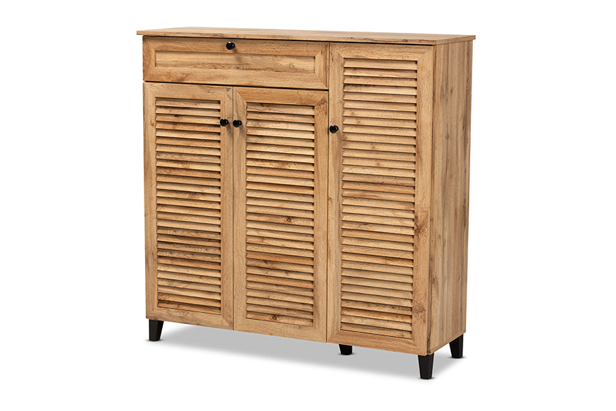 Baxton Studio Coolidge Modern and Contemporary Oak Brown Finished Wood 3-Door Shoe Storage Cabinet with Drawer
