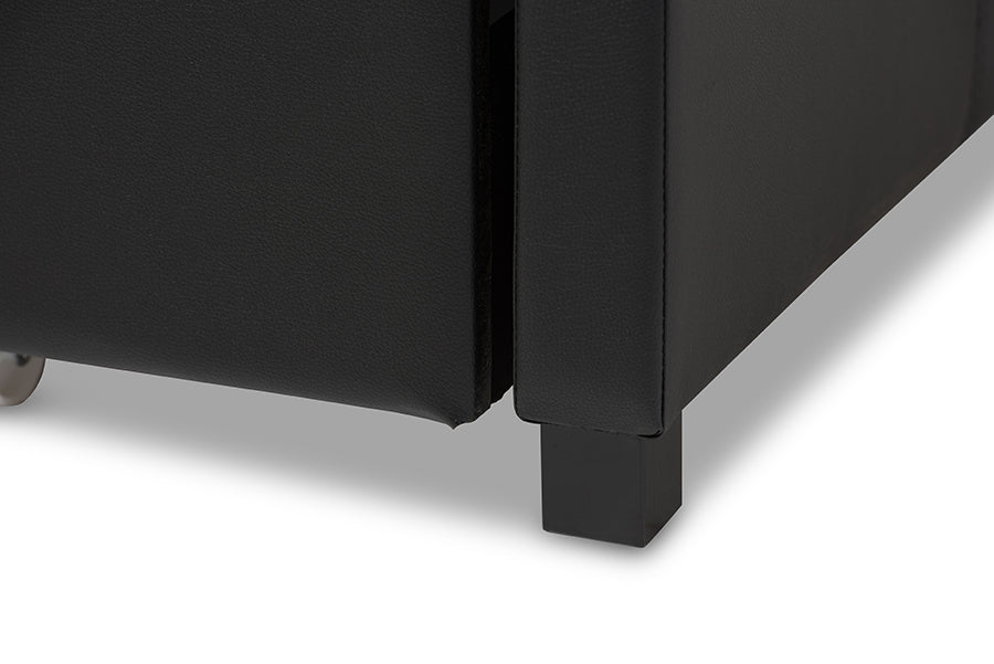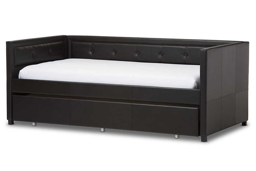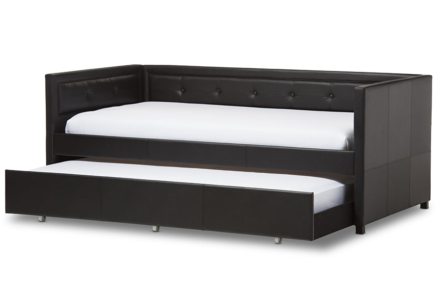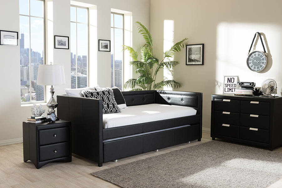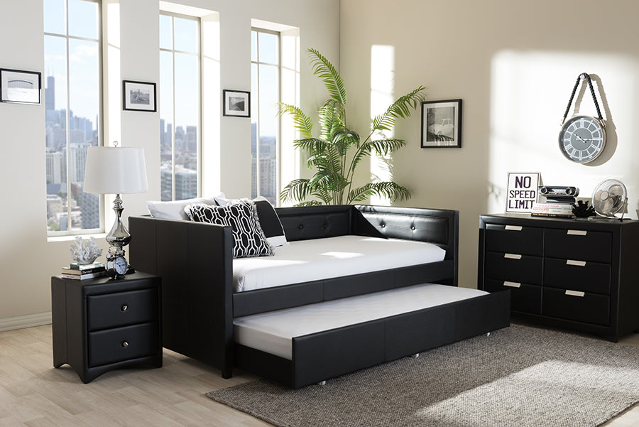 Baxton Studio Frank Modern and Contemporary Black Faux Leather Button-Tufting Sofa Twin Daybed with Roll-Out Trundle Guest Bed