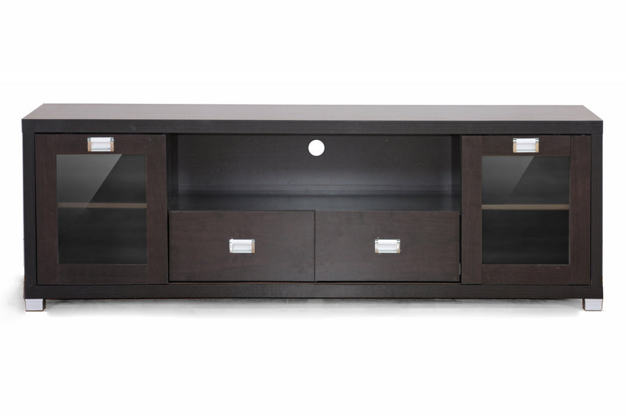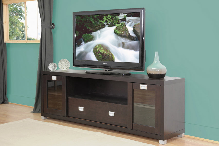 With a bevy of storage solutions and beautiful contemporary design, the Gosford TV Stand is the perfect perch for your television and accessories to reside. This modern entertainment center is made of lapped particle board with dark brown wood grain-effect paper veneer with water and scratch-resistant MB coating on the top panel. Two center drawers and two side cabinets frame a singular open storage space. Each side cabinet features inward-sliding tempered glass doors as well as a 3-position adjustable shelf. Silvertone metal drawer pulls finish off this television cabinet. The TV stand is made in Malaysia; assembly is required. To clean, dust with a dry cloth. Product dimension:69.4375"Wx15.5625"Dx23.3125"H. Upper compartment dimension:35.25"Wx13.625"Dx9.5"H with round -shaped hole in back for wire management( 2" in diameter) ,lower middle drawers(2) dimension:11.1875"W x 15.1875"D x 5"H, sliding door compartments (left and middle total 4 ): 14.625"Wx14.25"Dx8.625"H