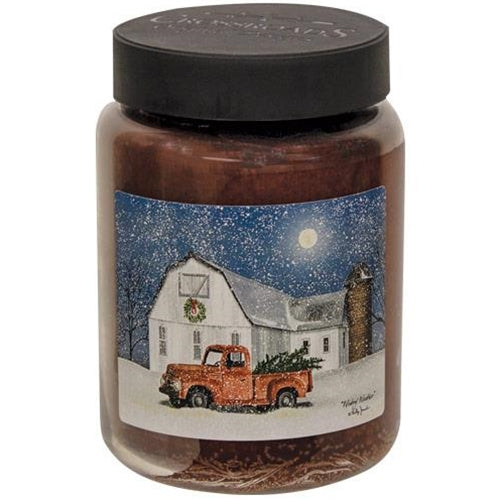 "Wintry Weather," 26 oz Jar Candle is filled with the delicious scent of cinnamon stikcs! The holiday art label is designed by Billy Jacobs and features a vintage truck that is hauling a Christmas tree. The 26-ounce jar candle is made in the USA from high-quality blended paraffin wax and has two lead-free wicks. Approximately 120-140 hour burn time. Hand-poured by Crossroads in Ohio!