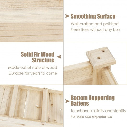 The perfect raised garden bed for an easy gardening project. Crafted out of selective fir wood this elevated planter box is with great solidity and extraordinary stability. It allows you to grow and manage your own greens without backache or kneeling down and also adds ample planting options on your deck balcony and anywhere. And the raised garden bed also fosters a healthy growing space for veggies and flowers with drain holes for ventilation and breathability. Give yourself a stunning flower display or fresh herb garden with the raised garden bed! Solid fir wood endures excellent durability and stability Maximum weight capacity of 220lbs Firmly connect with nails and mortise structure Ample growing space to plant herbs fruits vegetables and so on A planter solution on deck balcony indoor and outdoor Drainage holes provide water drainage and ventilation Fast installation with simple steps Untreated smooth surface no bad infect to veggies