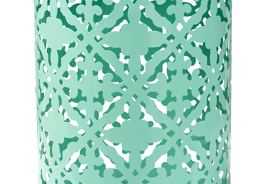 Design a cozy outdoor sanctuary with the delightful Jamila side table. Made in China, this table is constructed from solid metal featuring a cool aqua finish. Geometric cut-outs on the sides of the table form a unique, elegant display that allows light to pass through its frame. The Jamila will arrive fully assembled and utilizes a round, cylindrical shape for excellent stability. Whether used for outdoor snacks and drinks or to display decorations, the Jamila side table is an exquisite accent to any patio or deck.