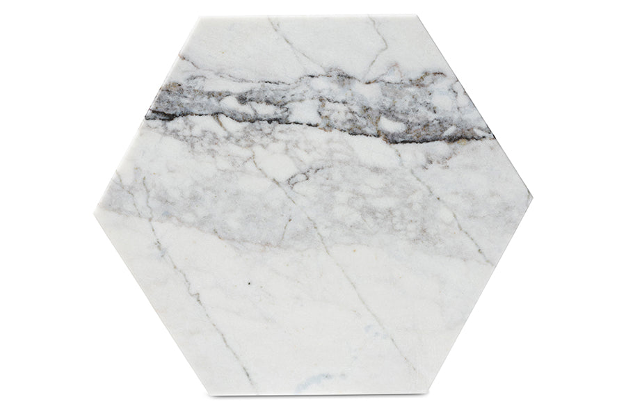 Give your space a beautiful yet practical accent of modern design with the Kalena end table. Made in China, this lovely piece is comprised of a solid metal base topped with a clean marble tabletop. The base features a smooth openwork design that allows light to flow more easily throughout the room. The Kalena will arrive fully assembled and utilizes a hexagon-shaped tabletop with crisp angles that exude geometric charm. A convenient and compact addition, the Kalena injects modern glamour to any interior space.