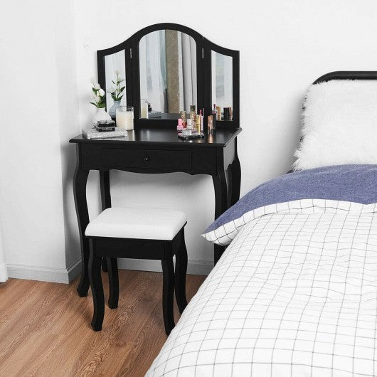 Vanity Makeup Dressing Table Set with Tri-Folding Mirror and Drawer-Black