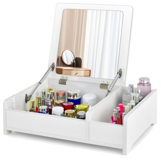 This space-saving countertop vanity table with a flip-top mirror is perfect for your daily makeup! Featuring a large hidden compartment and side open shelf this makeup table can store and organize most of your cosmetics jewelry skin care products etc. which can keep your desktop clean and tidy. The flip top mirror enables you to use this table as a dressing table or laptop desk conveniently. Besides the strong pneumatic rod and buffer device makes the mirror flip up and down smoothly and quietly. Made of premium engineered wood and glass our vanity table ensures excellent stability and long-lasting use. This multifunctional makeup vanity can organize your countertops and is suitable to be used in your bedroom study room apartment or bay window. Flip-top mirror is great for you to check your makeup and hairstyle Heavy duty pneumatic rod ensures smooth and silent lifting up/down High quality engineered wood ensures great stability and durability A large hidden compartment beneath the top for dust-free storage The side open compartment perfectly stores your often-used items Spacious tabletop allows you to put your laptop cup magazine etc Premium metal hinge and buffer device reduce noise and avoid bumping Can be placed on the dresser writing desk office desk to use Suitable for the bedroom closet living room study room and more Smooth and waterproof surface is easy to clean with damp cloth Complete hardware and clear instruction for easy assembly