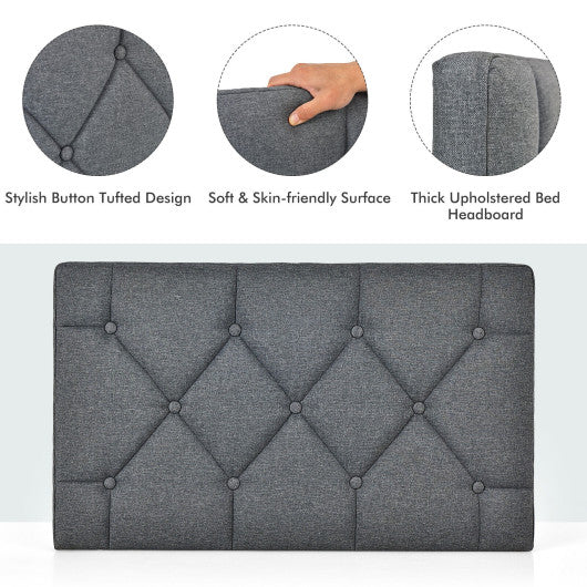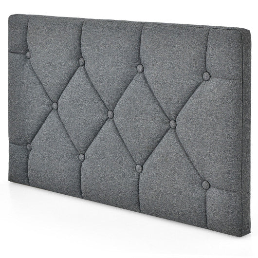 This upholstered headboard combines premium linen fabric and soft sponge into one to achieve optimal comfort and relaxation. Thick MDF frame also ensures sturdy and durable construction for a long lifespan. The attachment device and pre-drilled holes are capable of catering to different needs thus you can choose the suitable height according to the thickness of your mattress. Unique button ornament and elegant appearance are compatible with various homes styles which adds highlight to your home. This upholstered headboard will undoubtedly be a perfect complement for your existing bed frame! Sponge padded headboard gives you comfortable user experience Breathable linen fabric cover for skin-friendly touch and easy cleaning Durable MDF accounts for reliable structure for long-term use All side panels are wrapped to ensure safety use Perfect collocation for various bed frames of different sizes and styles Elegant appearance and button stitched design fits various room styles Can be firmly mounted to the wall with attachment device Detailed user guide to shorten your assembly time