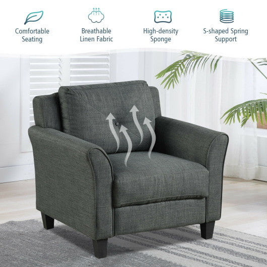 Snuggle comfortably on our modern sofa chair! The chair’s comfortable backrest and thick seat cushion are both padded with high-density sponge and covered with soft linen fabric to cozily support your back and buttocks. And with a scientific slanted design you are unlikely to get tired from long-time seating. Besides this accent chair also has curved armrests for comfortable enjoyment. Moreover the strong plywood frame makes this accent chair built to last. And 4 plastic legs with non-slip foot pads can stably support the seat. Its compact size and simple design help it match well with any home decorations and furniture. If you are looking for a modern sofa chair like this do not hesitate to place an order! Overstuffed backrest and seat cushion for comfortable seating Breathable linen fabric for soft touch Strong plywood frame ensures durability S-shaped spring bottom structure for long time use Plastic legs with foot pads prevent the scratches on the floor Have curved armrests beautiful and comfortable Ergonomically slanted back for good posture Elegant and modern design suitable for various home decorations Easy to assemble with easy-to-understand instruction Maximum weight capacity of 350 lbs