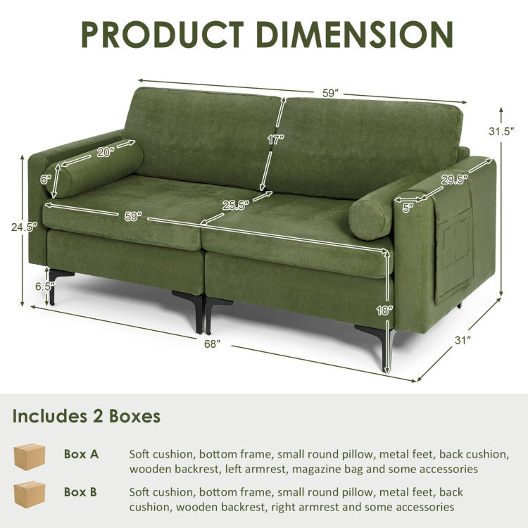 Specification: Color: Dark Green Material: Suede fabric sponge metal 2-Seat Overall dimension: 68" x 31" x 31.5" (L x W x H) Seat dimension: 59" x 25.5" (L x W) Seat height: 18" Load capacity of each seat: 660 lbs Net weight: 117 lbs Package includes: 1 x Loveseat sofa 1 x Armrest magazine pocket 2 x Bolster 1 x User manual 3-Seat Overall dimension: 97" x 31" x 31.5" (L x W x H) Seat size: 88.5" x 25.5" (L x W) Seat height: 18" Load capacity of each seat: 660 lbs Net weight of sofa with steel backrest: 166.5 lbs Package includes: 1 x Modular 3-seater sofa 2 x Bolster 1 x Armrest magazine pocket 1 x User manual 3-Seat L-Shaped Overall dimension: 97" x 51" x 31.5" (L x W x H) Seat height: 18" Load capacity of each seat: 660 lbs Net weight: 179.5 lbs Package includes: 1 x Modular sectional sofa 2 x Bolster 1 x Armrest magazine pocket 1 x User manual 4-Seat L-Shaped Overall dimension: 127" x 51" x 31.5" (L x W x H) Seat height: 18" Load capacity of each seat: 660 lbs Net weight of L-shaped sofa with 2 steel backrests: 229 lbs Package includes: 1 x L-shaped sofa couch 2 x Bolster 1 x Armrest magazine pocket 1 x User manual Please note that color difference may occur between different light and monitor.