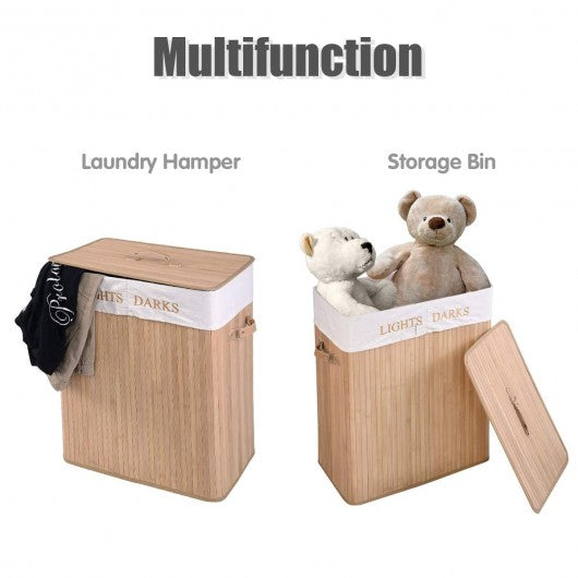 Double Rectangle Bamboo Hamper Laundry Basket Cloth Storage Bag Lid-Natrual