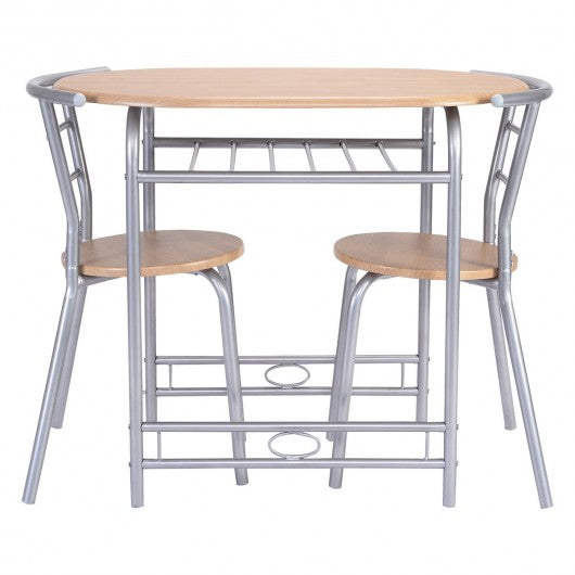 This 3 pieces simple table and chairs set is perfect for home use with its space-saving and delicate design. The simple design makes the whole set very neat and graceful. It can serve in many places such as kitchen dining room restaurant bistro and so on. With the space-saving design the back of the two chairs can perfectly be attached to the edge of the table when not in use. In addition there is a shelf under the table which can be used to put wines or other kitchen materials. Made of tough iron and MDF the whole set releases a kind of a sense of security which ensures that you have a nice meal.Don't hesitate to buy this 3 pieces simple table and chairs set. Brand new and good quality. Durable iron & MDF construction Perfect for your kitchen or living room Simple assembly required