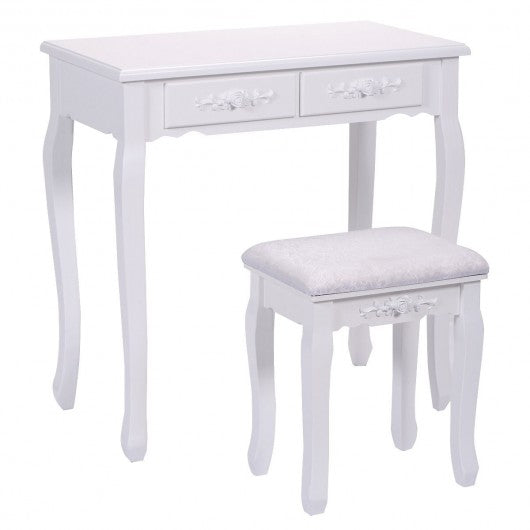 This beautiful and traditional style dressing table and stool set is the perfect choice for any room. Made of thick MDF panel and wood legs this vanity table set is sturdy and durable enough to serve you a long time. The dressing table has 4 drawers providing plenty of storage space. The spacious tabletop is large enough for you to display and organize all kinds of cosmetic and makeup tools. The large mirror easily reflects images clearly. The table comes with a cushioned stool with beautiful patterns so you can sit comfortably when doing makeup. The dressing table set is a perfect choice for any room. Do not hesitate just buy one! High quality and brand new Exquisite and fine craftsmanship Made of MDF panel and wood leg sturdy and durable Vanity table is elegant and clean-lined 4 drawers provided for storing jewelry and ornaments Drawers with flower handle for easy putting out and in A beautiful mirror is appropriate for you to watch your makeup or dress Spacious tabletop it can be as an office table or a nightstand in your home Curved pinewood legs give strong support to the table and stool Simplicity makes you feel fresh and natural and match any decoration of your room or home A matched cushioned stool provided Beautiful flower pattern on the seat elegant The height of stool legs perfectly matches that of table and mirror Simple assembly needed and all the hardware included FSC forest certification
